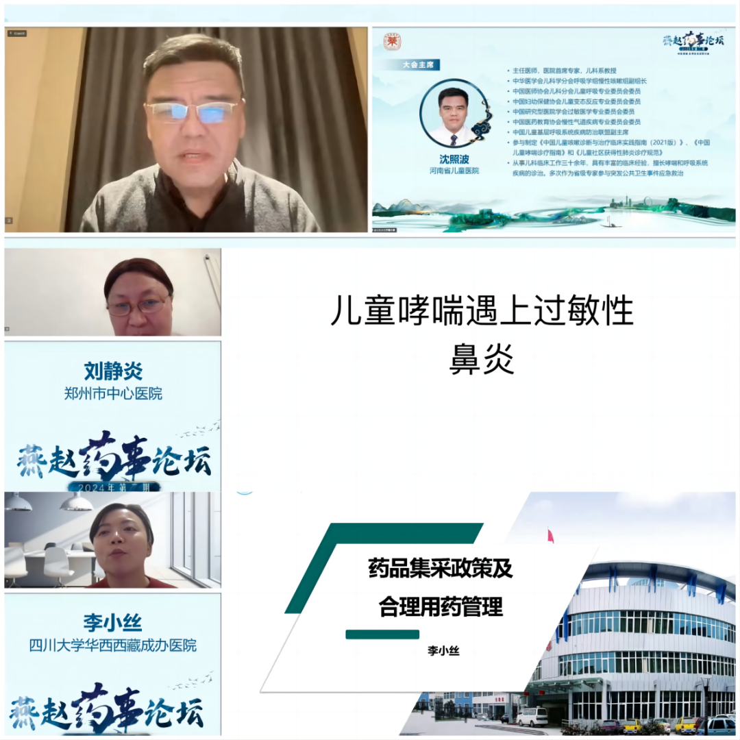 河南省儿童医院儿科沈照波教授开场致辞并主持学术报告环节。四川大学华西西藏成办医院药学部李小丝教授作题为《集采政策及合理用药管理》的报告。郑州市中心医院儿科刘静炎教授作题为《儿童哮喘遇上过敏性鼻炎》的报告。郑州市中心医院药学部何勐教授主持讨论,与会专家就变应性鼻炎合并哮喘的综合管理,关注变应性鼻炎合并症,带量采购下的合理用药进行了深入讨论。