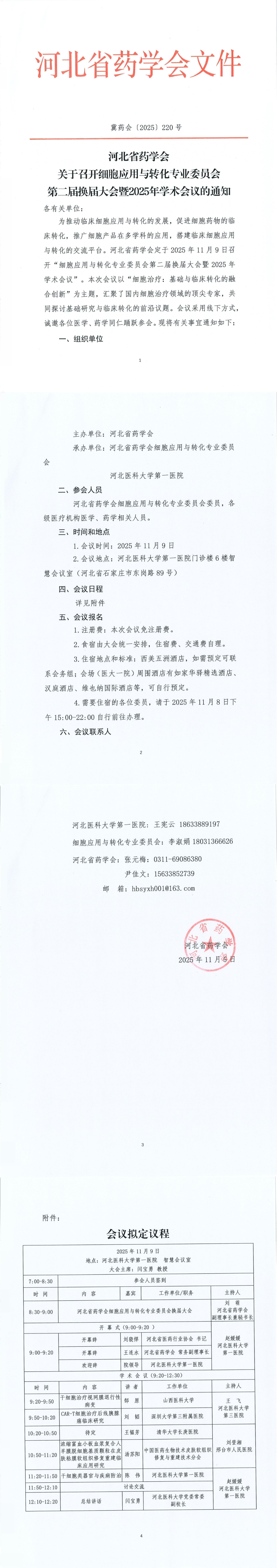 河北省药学会关于召开细胞应用与转化专业委员会第二届换届大会暨2025年学术会议的通知