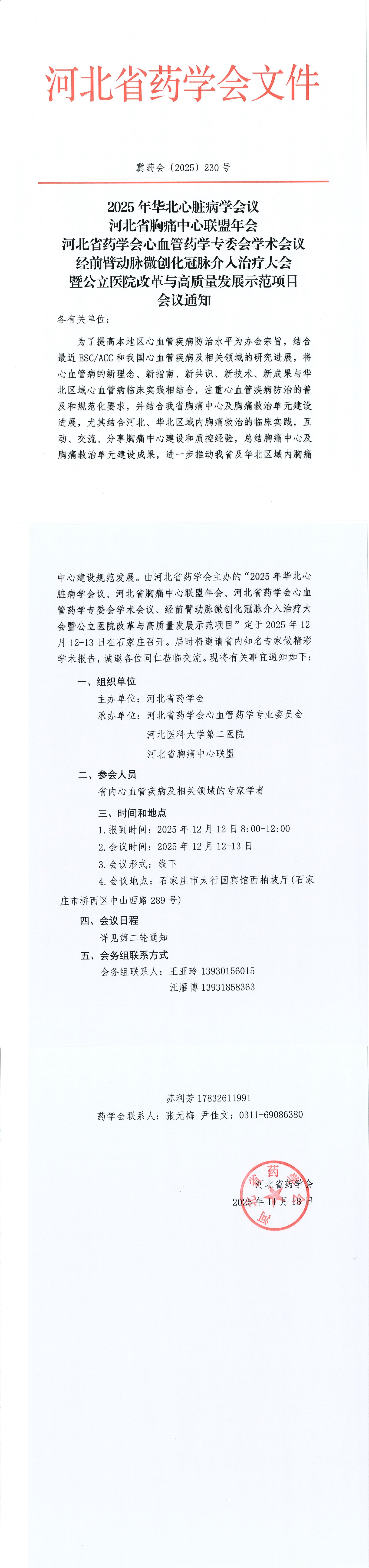 华北心脏病学会议河北省胸痛中心联盟年会河北省药学会心血管药学专委会学术会议(第一轮)
