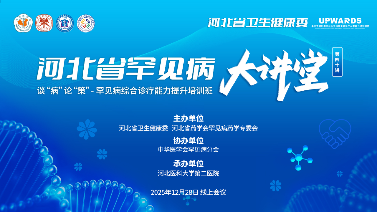 2025年12月28日,由河北省卫生健康委、中国罕见病联盟、河北省药学会罕见病药学专委会主办,中华医学会罕见病分会协办,河北医科大学第二医院承办的第40期河北省罕见病大讲堂顺利召开。会议采用线上会议,可通过中国罕见病联盟小程序观看。
