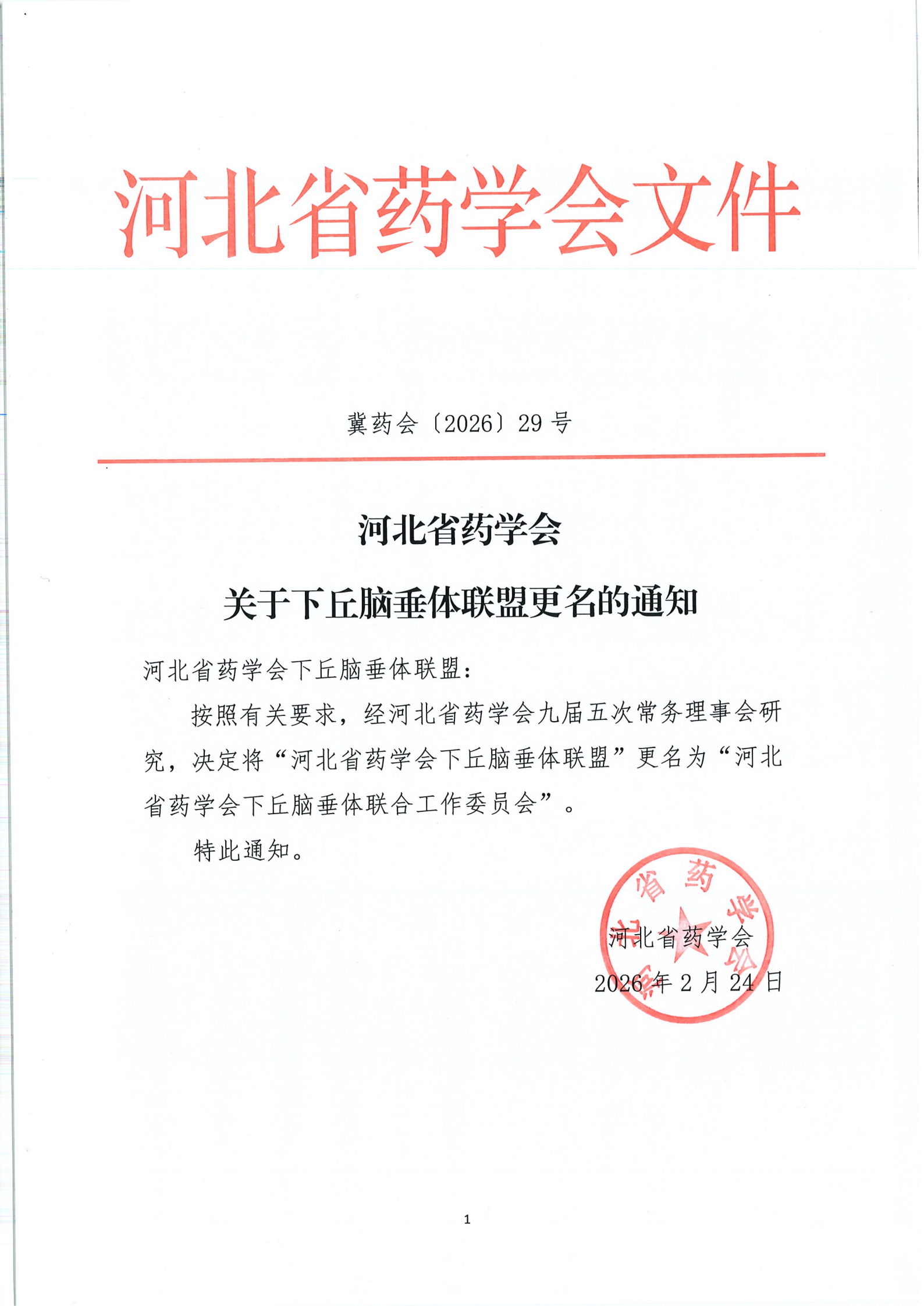 河北省药学会关于下丘脑垂体联盟更名的通知