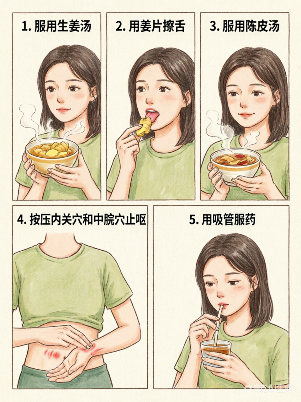 内关穴腕横纹上三横指是止呕要穴,服药前用拇指按压3分钟能调节胃气下降。配合中脘穴肚脐上四寸顺时针按摩,可增强脾胃运化功能,预防药液上逆。